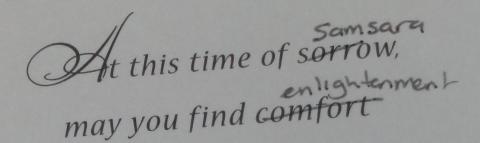 A benefactor had contributed to the teachings of His Holiness the Dalai Lama and to the Sera Je Food Fund. Rinpoche wrote this card, thanking the donor for their kindness.
