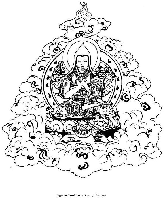 The Teachings were handed down from the great Indian Pandits to the great Guru Tzong.k’a.pa (about 1380 A.D.) through about twenty famous meditators in thelineage of the Ka.dam.pa tradition. From Guru Tzong.k’a.pa the Teachings were passed on through seventeen or eighteen of his disciples.