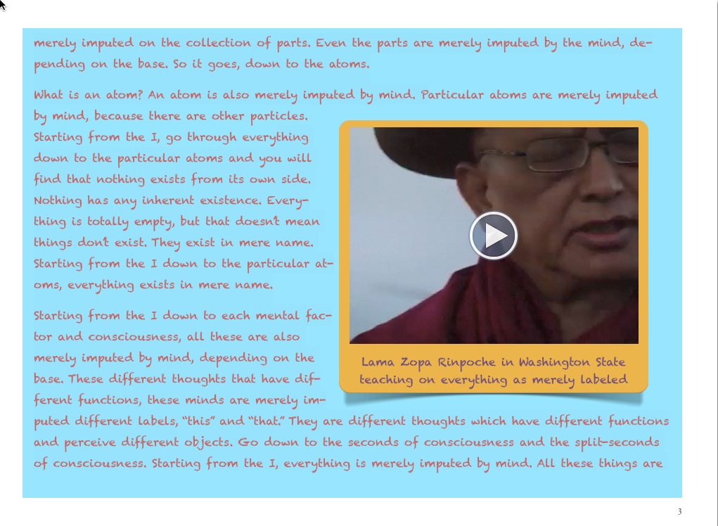 Emerging publishing technologies now enable us to go beyond our already established means for making these teachings available. Using our amazing resources, we can develop a completely new kind of Dharma book: a multimedia presentation that brings all these media together in a seamless presentation that draws the reader ever more deeply into the teachings.
