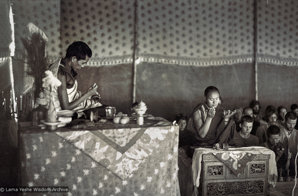 (09754_sl-3.JPG) Lama Zopa Rinpoche teaching in the tent, Kopan Monastery, Nepal, 1974. For the Seventh Meditation Course a huge Indian wedding tent replaced the dusty burlap-walled tent. Wendy Finster (photographer)