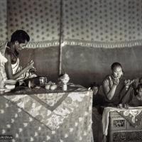 (15884_sl.psd) Photo of the lamas and sangha doing puja in the tent, Kopan Monastery, Nepal, 1974. For the Seventh Meditation Course a huge Indian wedding tent replaced the dusty burlap-walled tent.